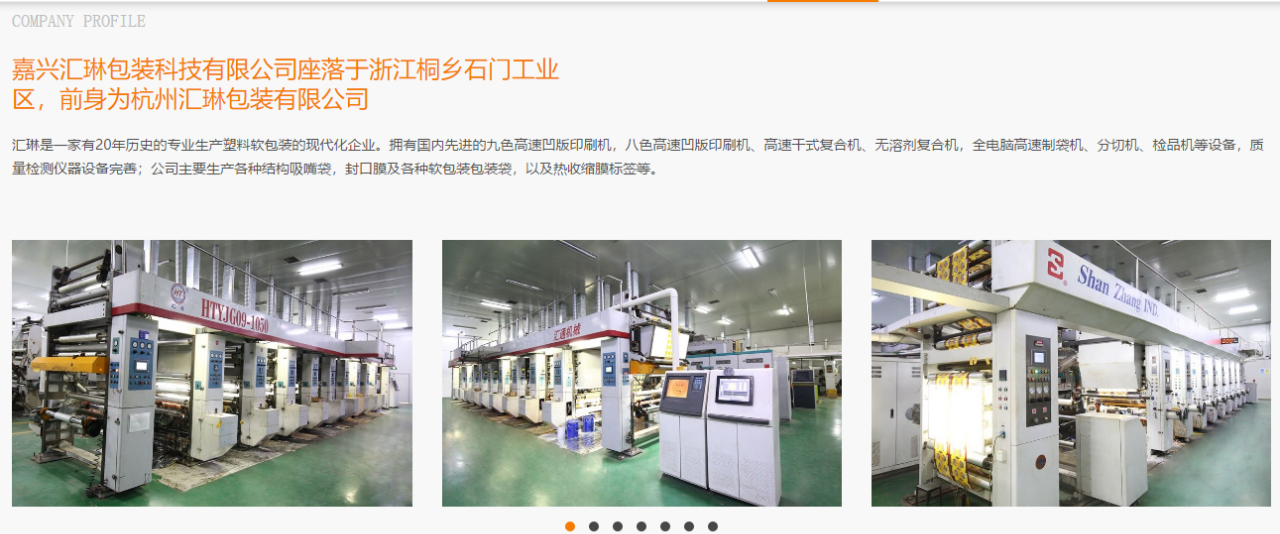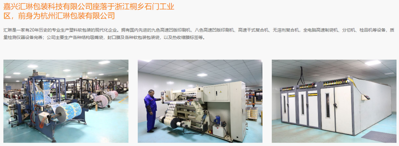 嘉兴汇琳包装科技有限公司是一家有着20年历史的专业生产高温蒸煮自立袋、高温蒸煮封盖膜等塑料软包装的现代化企业。拥有汕樟九色、汇通八色高速凹版印刷机,汕樟高速干式、泽通无溶剂复合机,多台制袋机等先进设备。